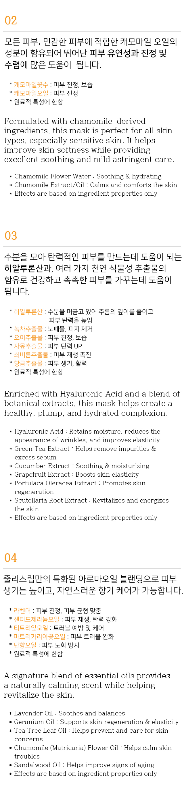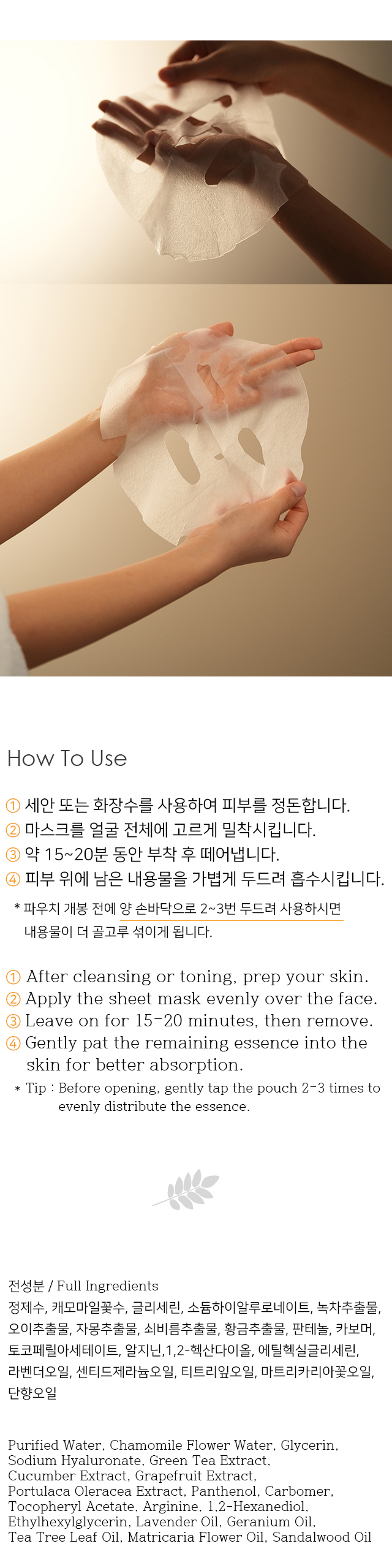 캐모마일 오일이 함유된 천연 시트 마스크 (모든 피부, 민감한 피부용)